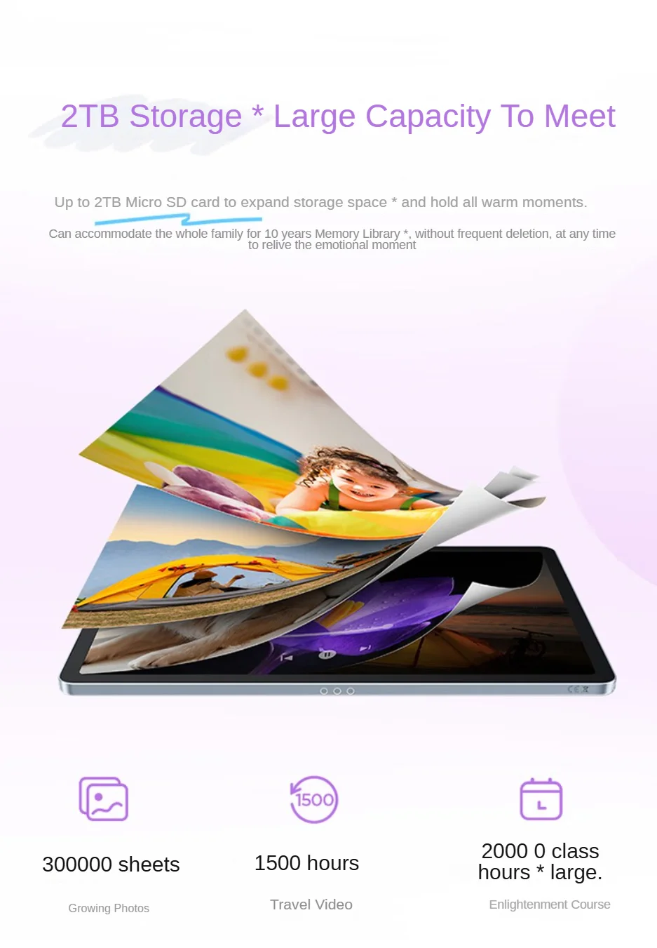 The Micro SD card needs to be purchased separately. The description of the capacity and performance of the Micro SD card only represents the expansion capability. The effect is only for illustration. The specific compatibility situation is subject to the actual experience.